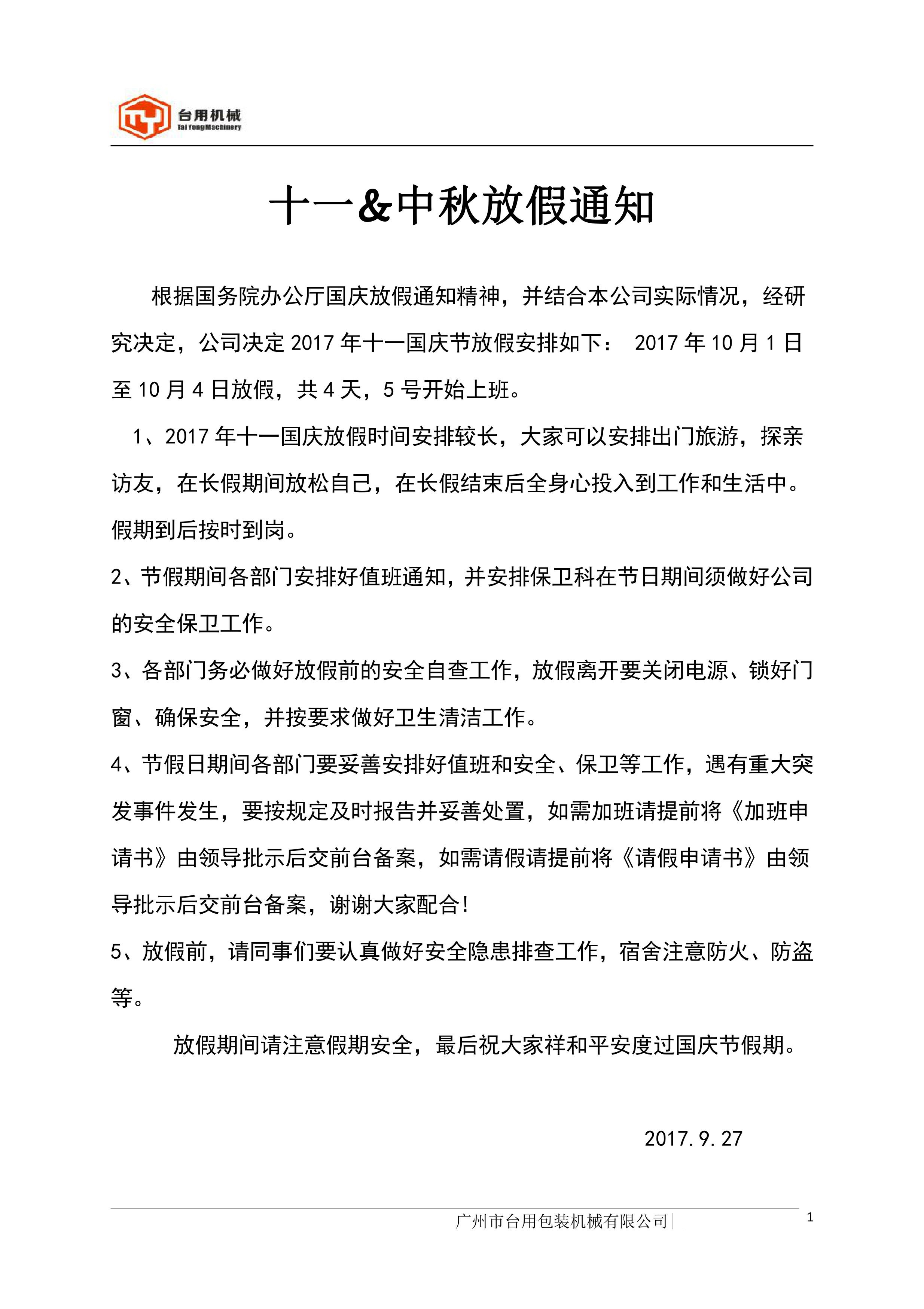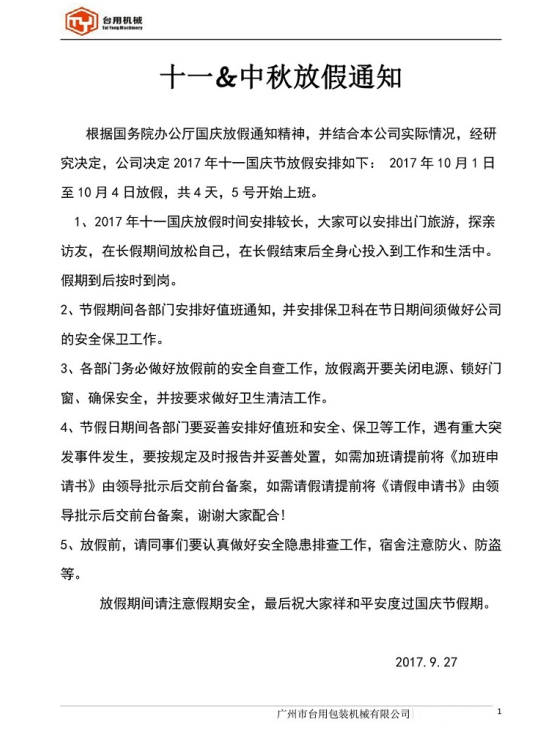 您的位置:主頁(yè)  > 新聞中心  > 公司新聞  > 2017年十一&中秋放假通知